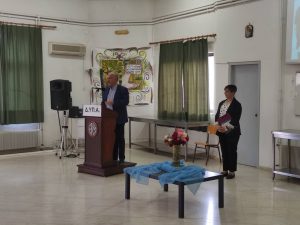 Στη συνέχεια η εκπαιδευτικός της Σχολής κα Ραγκαβά Ευαγγελία ως κεντρική ομιλήτρια της εκδήλωσης ενημέρωσε λεπτομερώς για την επαγγελματική εκπαίδευση και κατάρτιση της Δ.ΥΠ.Α., αλλά και για τον θεσμό της «Μαθητείας» (απασχόλησης των μαθητών σε Επιχειρήσεις του Δημόσιου και Ιδιωτικού Τομέα με αμοιβή, παράλληλα με τις σπουδές τους) το οποίο εφαρμόζει η Δ.ΥΠ.Α. (τέως ΟΑΕΔ) από το 1952 με επιτυχία.