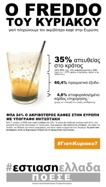 Όχι για να κάνουμε αντιπολίτευση επί τούτου, αλλά γιατί πραγματικά, κανείς μας δεν καταλαβαίνει το γιατί! Ποσώς δε μάλλον, ο μέσος Έλληνας, που θα δει τον καφέ του ξαφνικά, να απογειώνεται στα 4 και στα 5 ευρώ. Ξαφνικά, να κόβεται η «ανάσα» του…