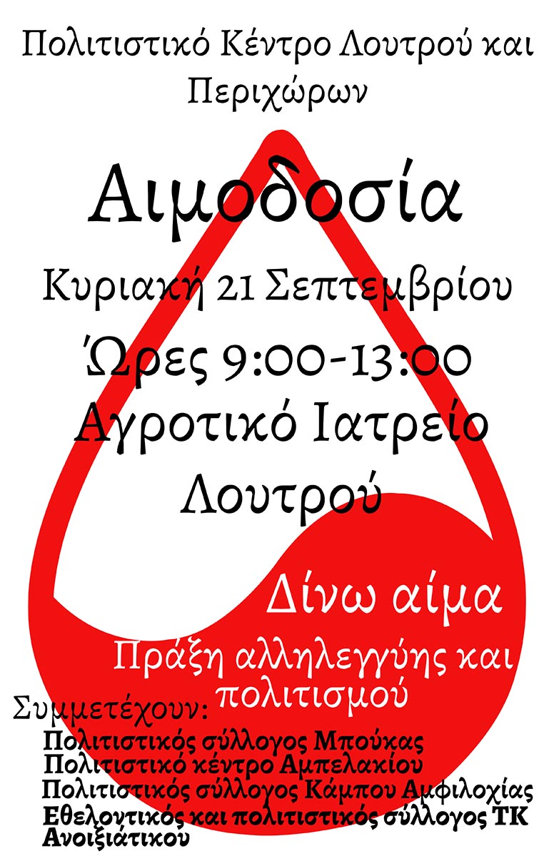 Την Κυριακή 21 Σεπτεμβρίου από τις 9.00 έως 13.00 στο Αγροτικό ιατρείο Λουτρού, θα γίνει τακτική εθελοντική αιμοδοσία, που διοργανώνει το Πολιτιστικό κέντρο Λουτρού και περιχώρων με την υποστήριξη του Γ.Ν. Αιτωλοακαρνανίας – Νοσηλευτική μονάδα – Τμήμα Αιμοδοσίας και τη συνεργασία του Συλλόγου Εθελοντών Αιμοδοτών Αγρινίου.