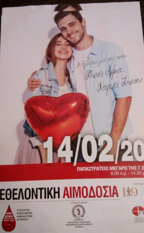 Την Παρασκευή 14 Φεβρουαρίου απο 08:00 έως 14:30 Ο Σύλλογος Εθελοντών Αιμοδοτών Αγρινίου σε συνεργασία με τον Σύλλογο Δικαστικών Υπαλλήλων Αγρινίου συνδιοργανώνουν εθελοντική αιμοδοσία.Δίνουμε όλοι πέντε λεπτά απο το χρόνο μας.Δίνω αίμα χαρίζω ζωή.