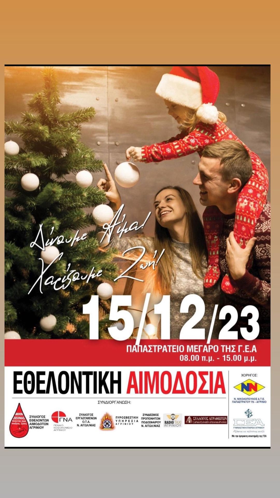 Εθελοντική αιμοδοσία στο Αγρίνιο στις 15/12