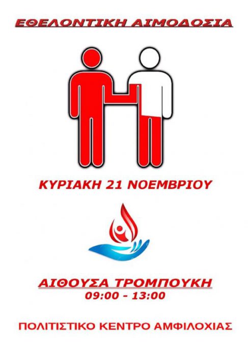 Εθελοντική Αιμοδοσία, που θα πραγματοποιηθεί την Κυριακή 21 Νοεμβρίου 2021 στην Αίθουσα Τρομπούκη από 9:00 π.μ. έως 13:00 μ.μ.