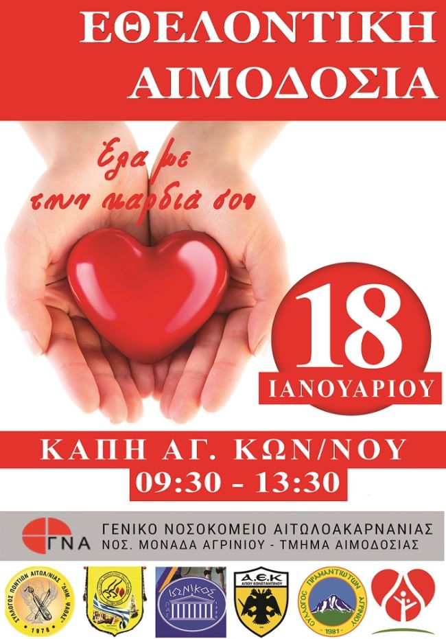 Το Τμήμα Αιμοδοσίας του Νοσοκομείου Αγρινίου θα είναι την Κυριακή στις 18 Ιανουαρίου 2026 από τις 09:30 το πρωί έως τις 13:30 στο ΚΗΦΗ (πρώην ΚΑΠΗ) Αγίου Κωνσταντίνου για να παραλάβει το δώρο σας.