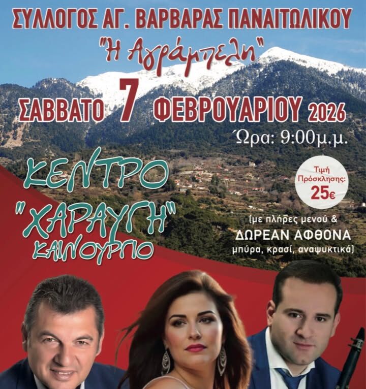 Ο Σύλλογος Αγίας Βαρβάρας Παναιτωλικού «Η Αγράμπελη» σας προσκαλεί στον ετήσιο χορό που διοργανώνει το Σάββατο 7 Φεβρουαρίου 2026 και ώρα 21:00 στο κοσμικό κέντρο «Χαραυγή» στο Καινούργιο Αγρινίου.