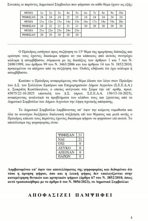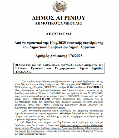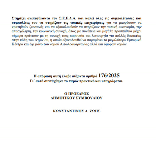 Το Δ.Σ του ΣΕΕΔΑ μετά την ανάρτηση στη Διαύγεια της 176/2025 απόφασης του Δημοτικού Συμβουλίου Αγρινίου θέλει με την σημερινή του ανακοίνωση να ευχαριστήσει όλους τους Δημοτικούς Συμβούλους τόσο της συμπολίτευσης, όσο και των δύο Δημοτικών παρατάξεων της ελάσσονος αντιπολίτευσης  που παρευρέθηκαν στη συνεδρίαση της 29ης Οκτωβρίου 2025.