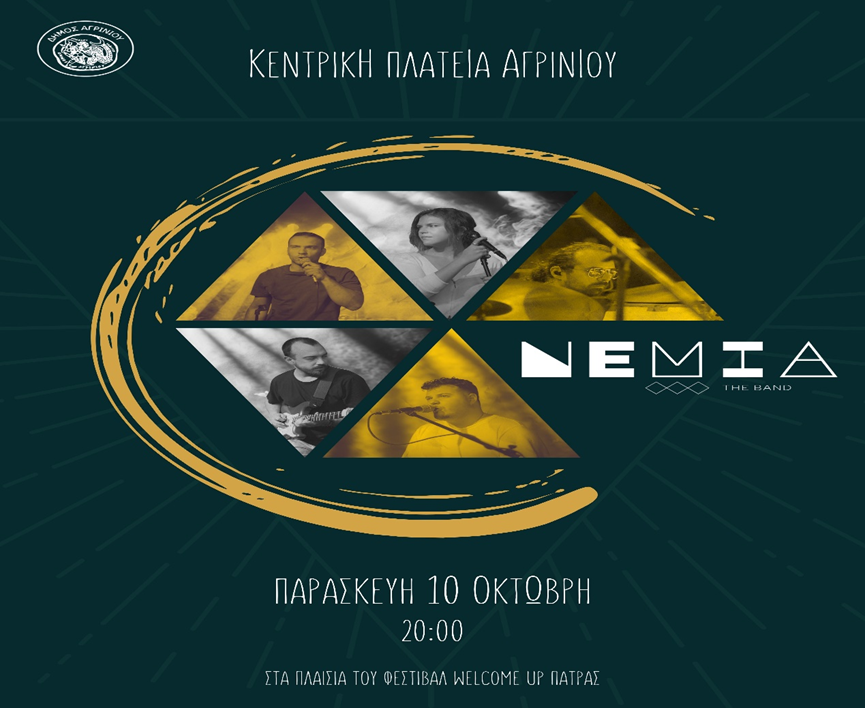 Μετά την επιτυχημένη συναυλία του καλοκαιριού στον θερινό κινηματογράφο Ελληνίς το συγκρότημα ΝΕΜΙΑ , σε συνεργασία τον Δήμο Αγρινίου και στα πλαίσια του φεστιβάλ Welcome up 2025, υποδοχής των πρωτοετών φοιτητών του Πανεπιστημίου στην πόλη του Αγρινίου , επιστρέφει για ακόμα συναυλία στην Πλατεία Δημοκρατίας, την Παρασκευή 10 Οκτωβρίου.