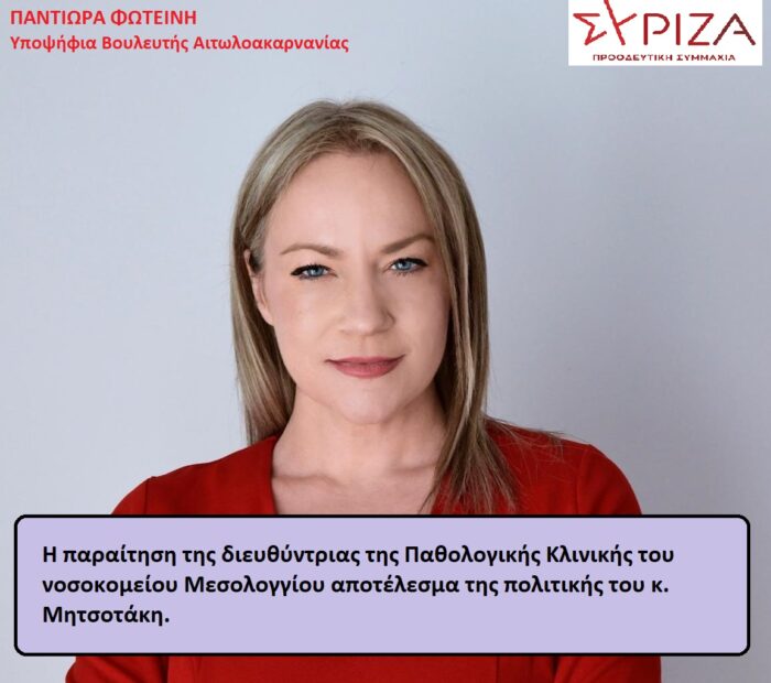Η σημερινή ανακοίνωση παραίτησης της Διευθύντριας της Παθολογικής Κλινικής του Νοσοκομείου Μεσολογγίου, κ. Κατερίνας Βογιατζή, έπειτα από 28 χρόνια αδιάλειπτης προσφοράς στο ΕΣΥ, έρχεται να προστεθεί στον μακρύ κατάλογο γιατρών που αναγκάζονται σε παραίτηση λόγω των τεράστιων ελλείψεων σε ιατρικό προσωπικό και μέσα.