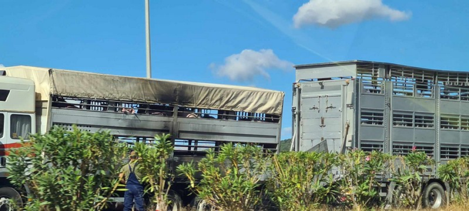 Το φορτηγό με την ρυμουλκούμενη καρότσα που επίσης μεταφέρει ζώα, κινούνται στην Ιόνια Οδό με κατεύθυνση προς Αντίρριο, όταν στο ύψος της Knauf στην Αμφιλοχία άρχισαν να βγαίνουν καπνοί.