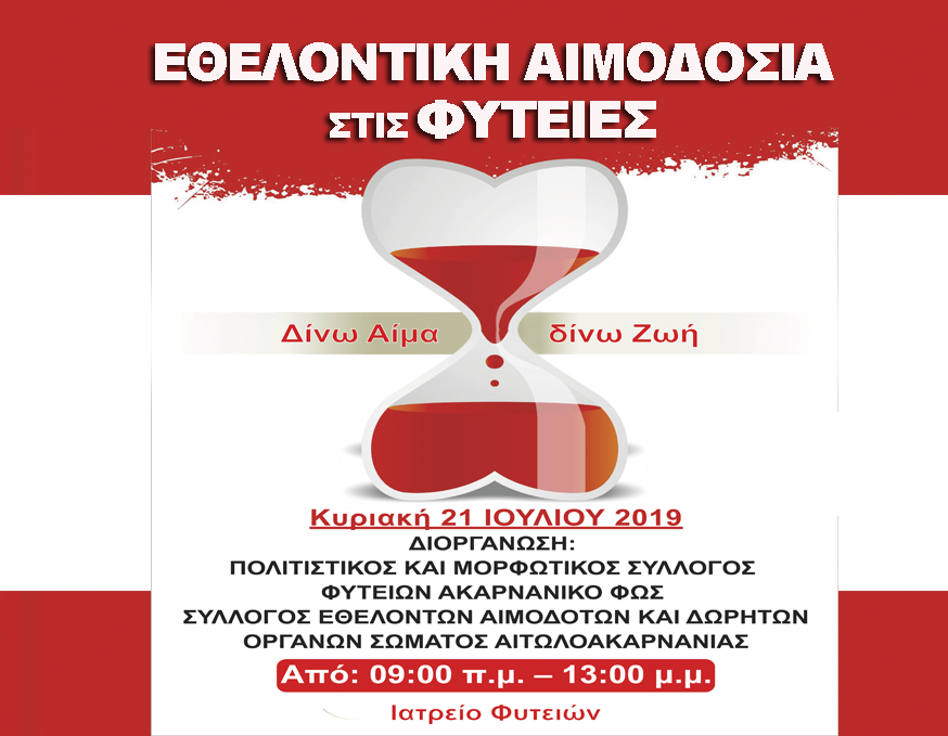O Πολιτιστικός και Μορφωτικός Σύλλογος Φυτειών σε συνεργασία με το Σύλλογο Εθελοντών Αιμοδοτών και δωρητών οργάνων σώματος Ν. Αιτωλοακαρνανίας και το Γενικό Νοσοκομείο Αγρινίου διοργανώνουν εθελοντική αιμοδοσία την Κυριακή 21/07/2019 από τις 09:00 πμ. – 13:00 μμ. στο Ιατρείο Φυτειών.