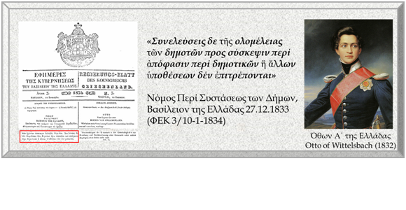 «Συνελεύσεις δε της ολομέλειας των δημοτών προς σύσκεψιν περί απόφασιν περί δημοτικών ή άλλων υποθέσεων δεν επιτρέπονται.» Νόμος περί Συστάσεως των Δήμων, Βασίλειον της Ελλάδος, 27.12.1833 (ΦΕΚ 3/10-1-1834).