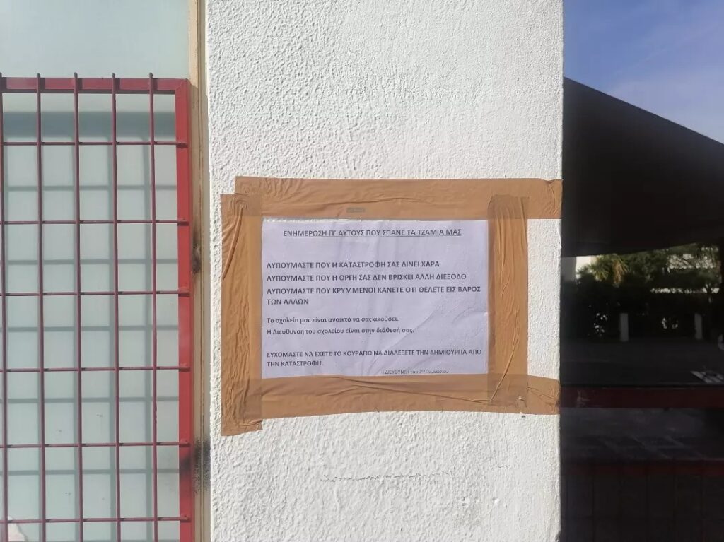 “Λυπούμαστε και στέλνουμε μήνυμα Τα αρκετα χρηματα που θα κοστίσουν ξανά τα τζαμια, θα γινόταν ομορφιά και laptop για το σχολείο μας.. Αυτά…” και ανάρτησαν και την σχετική ανακοίνωση στον τοίχο του σχολείου