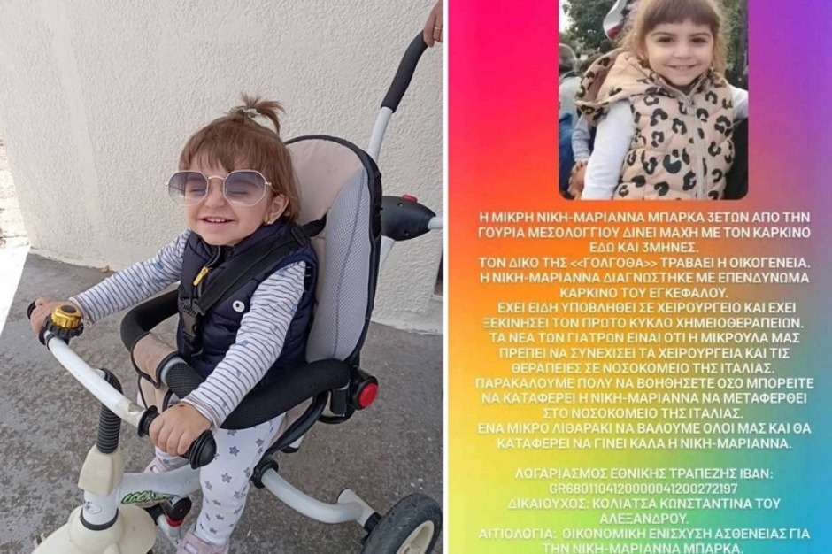Η Νίκη-Μαριάννα ένα τρίχρονο κοριτσάκι από τη Γουριά Μεσολογγίου, δίνει μάχη με τον καρκίνο εδώ και τρεις μήνες. Οι γιατροί είπαν στους γονείς ότι πρέπει να πάει στο εξωτερικό για να συνεχίσει τις θεραπείες της και να υποβληθεί στα απαραίτητα χειρουργεία.