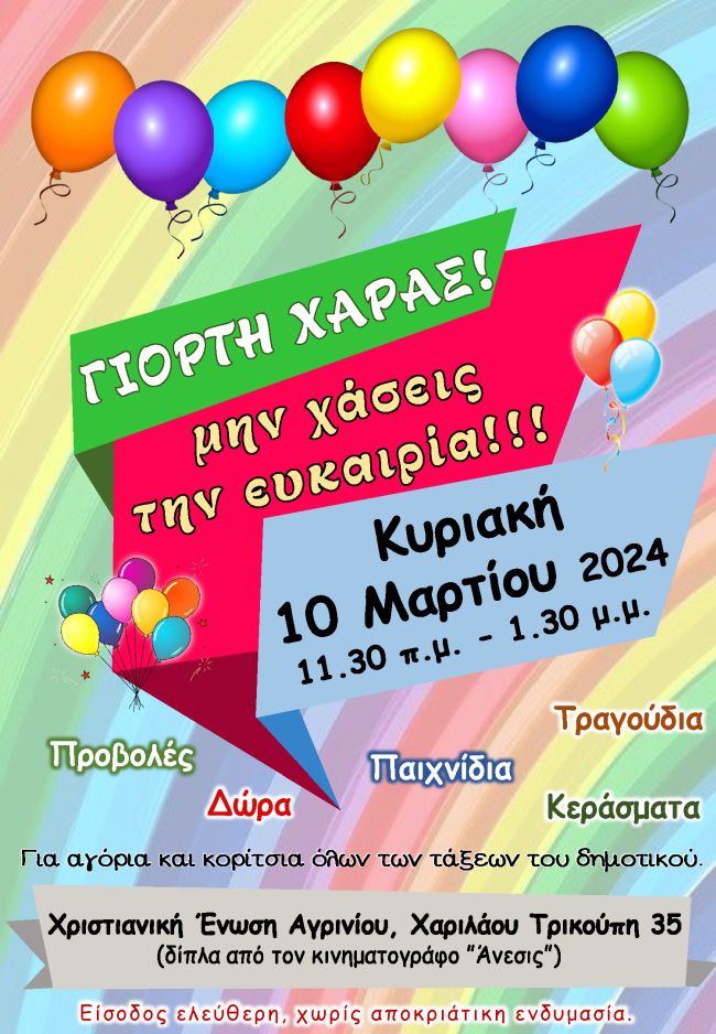 Η Χριστιανική Ένωση Αγρινίου, όπως κάθε χρόνο τέτοιες μέρες, διοργανώνει ένα δίωρο απασχόλησης με προβολές, τραγούδια, παιχνίδια, κεράσματα,