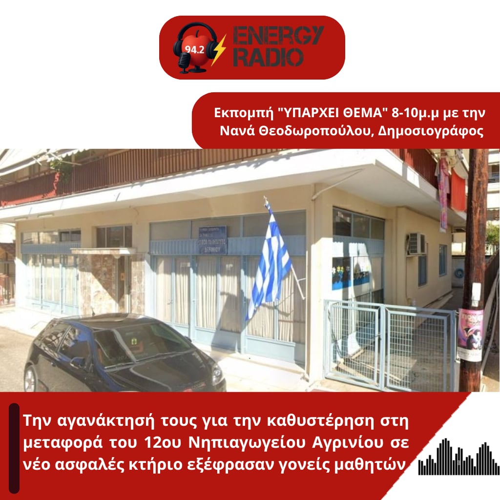 Την αγανάκτησή τους για την καθυστέρηση στη μεταφορά του 12ου Νηπιαγωγείου Αγρινίου σε νέο ασφαλές κτήριο εξέφρασαν γονείς μαθητών στην εκπομπή «ΥΠΑΡΧΕΙ ΘΕΜΑ» με την δημοσιογράφο Νανά Θεοδωροπούλου στον Energy 94.2 .