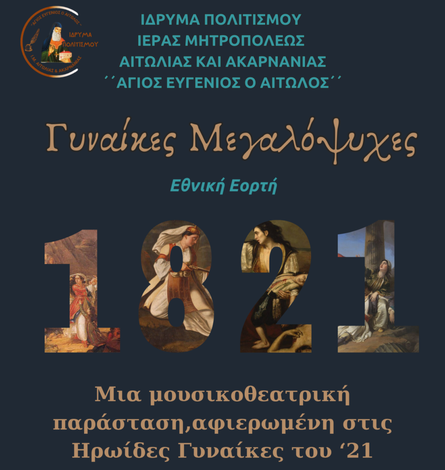 Η Ιερά Μητρόπολη Αιτωλίας και Ακαρνανίας, τιμώντας την επέτειο της Ελληνικής Επαναστάσεως του 1821, διοργανώνει επετειακή εκδήλωση με τίτλο: «Γυναίκες Μεγαλόψυχες».