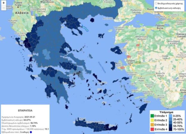 Σύμφωνα με τον χάρτη επιδημιολογικής επιτήρησης της Πολιτικής Προστασίας, στην Ελλάδα η εμβολιαστική κάλυψη ανέρχεται στο 60,67% και ο μέσος όρος κρουσμάτων ανά 7ημερο στα 19,1 ανά 100.000 κατοίκους.