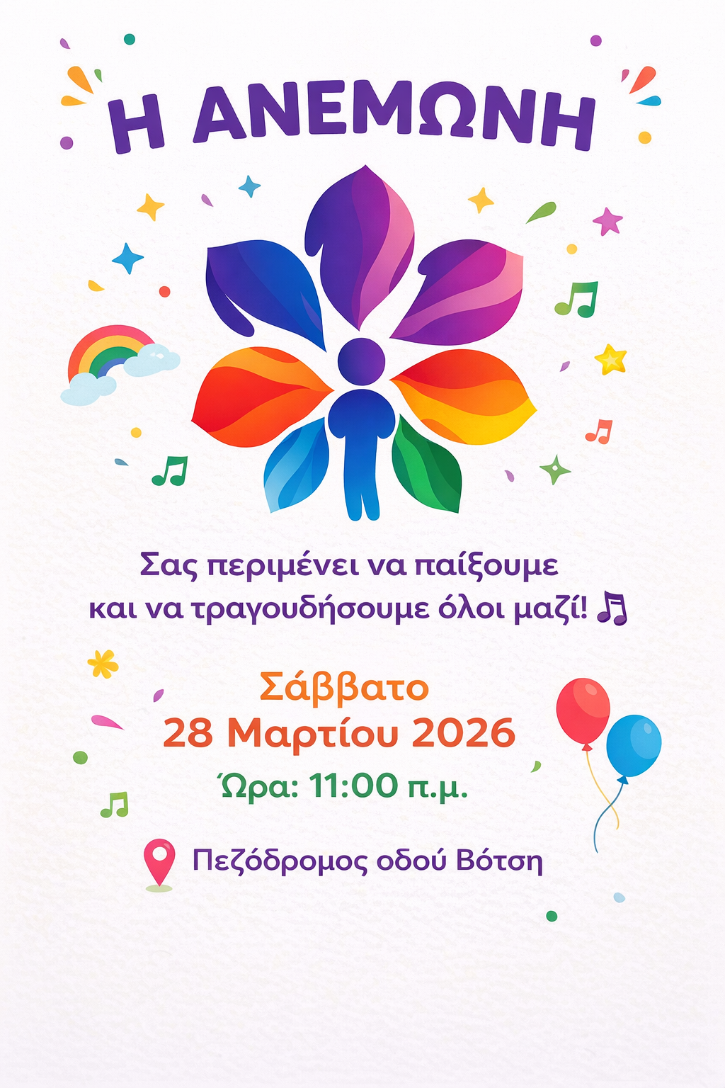 Αρχή κάνουμε το Σάββατο 28 Μαρτίου 2026 στις 11π.μ.. Θα βρισκόμαστε τον Πεζόδρομο της οδού Βότση ,όπου θα περιμένουμε μικρούς και μεγάλους να παίξουμε και να τραγουδήσουμε παρέα σε μια πράξη συμπερίληψης, στέλνοντας μήνυμα ισοτιμίας και κοινωνικής δικαιοσύνης.