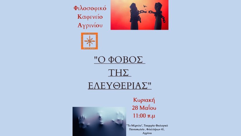 Η δεύτερη συνάντηση του Φιλοσοφικού Καφενείου Αγρινίου θα πραγματοποιηθεί την Κυριακή, 28 Απριλίου 2023 (11.00-13.00), με θέμα συζήτησης: «Ο ΦΟΒΟΣ ΤΗΣ ΕΛΕΥΘΕΡΙΑΣ», στο φιλόξενο χώρο «Το Μύρτιλο», Τσαγερία- Βιολογικό Παντοπωλείο, Φιλελλήνων 41, Αγρίνιο.