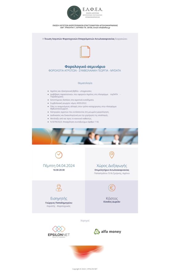 Στο πλαίσιο της διαρκής επιμόρφωσης των μελών της και των λογιστών γενικά, η Ε.Λ.Φ.Ε. Αιτωλοακαρνανίας διοργανώνει φορολογικό σεμινάριο με θεματολογία: