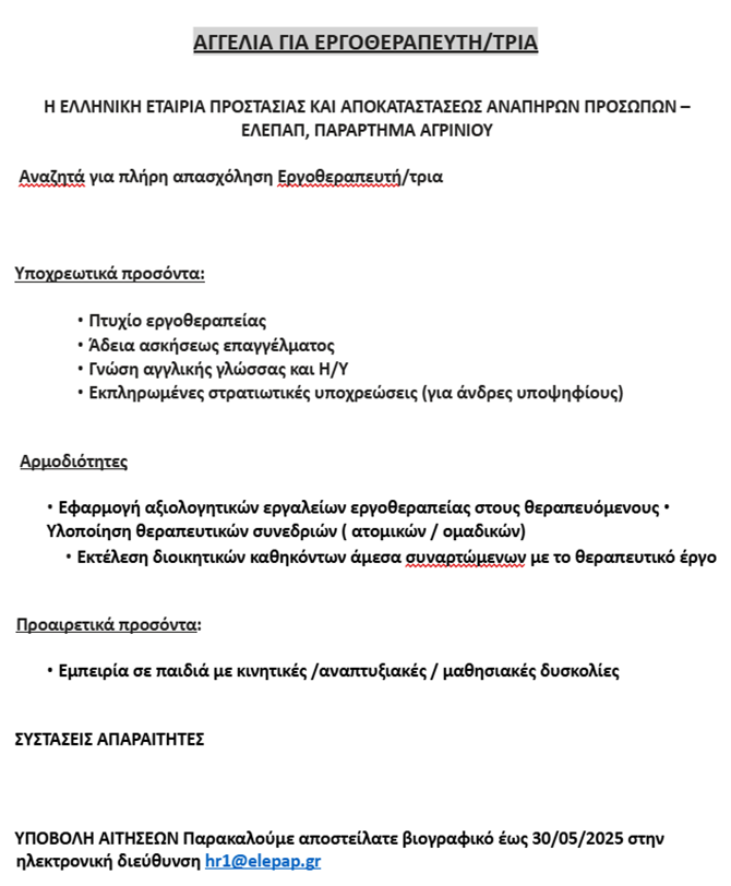 Η ΕΛΕΠΑΠ Αγρινίου ζητά για πλήρη απασχόληση Εργοθεραπευτή/τρια