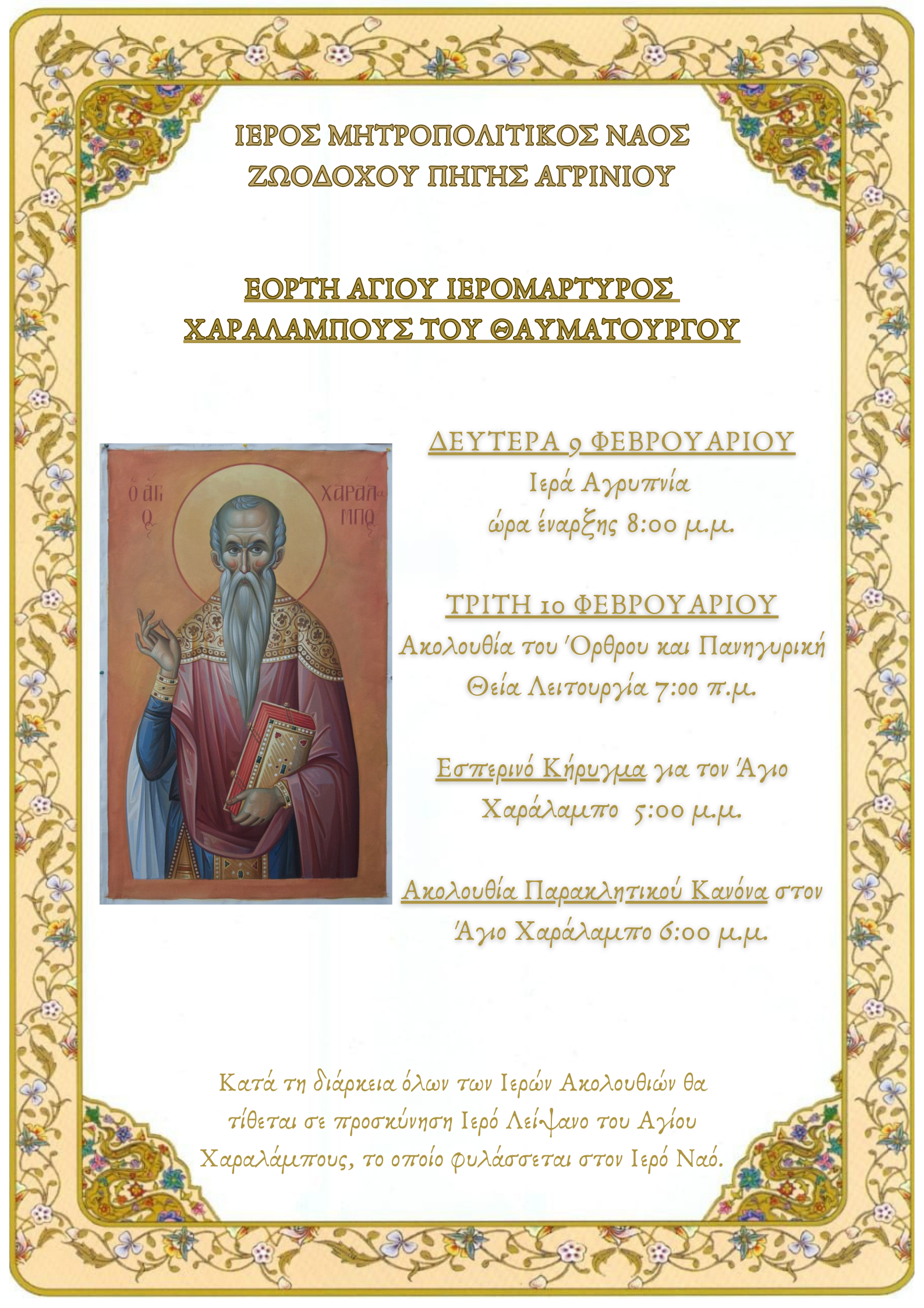 Το απόγευμα και ώρα 17:00’ θα πραγματοποιηθεί εσπερινό κήρυγμα για τον Άγιο Χαράλαμπο και στη συνεχεία ο Παρακλητικός Κανόνας του Αγίου.
