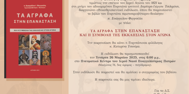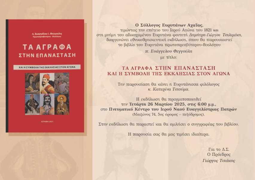 Ο Σύλλογος Ευρυτάνων Αχαΐας, τιμώντας την επέτειο του Ιερού Αγώνα του 1821 και στη μνήμη του αδικοχαμένου Ευρυτάνα φοιτητή Δημήτρη-Γιώργου Τσιλιμέκη, διοργανώνει εθνικοθρησκευτική εκδήλωση, στην οποία θα παρουσιαστεί το βιβλίο του Ευρυτάνα πρωτοπρεσβύτερου-θεολόγου π. Ευάγγελου Φεγγούλη με τίτλο: