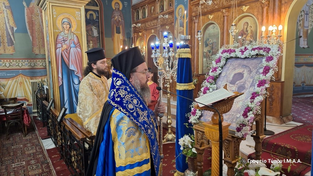 Ο Σεβασμιώτατος έψαλλε τους Οίκους ενώπιον της εικόνας της Θεοτόκου, συμπαραστατούμενος από τον Πρωτοπρ. Κωνσταντίνο Αθανασόπουλο, Προϊστάμενο του Ναού και τους διακόνους π. Δημήτριο Λαγούδη και π. Ιάκωβο Τρομπούκη,
