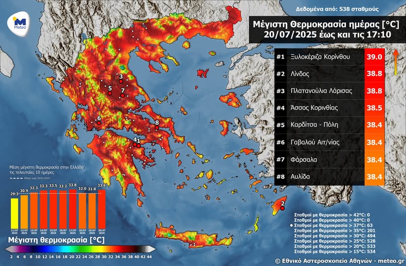 Σύμφωνα με το δίκτυο αυτόματων μετεωρολογικών σταθμών του Εθνικού Αστεροσκοπείου Αθηνών / meteo.gr η μέγιστη θερμοκρασία καταγράφηκε στην Ξυλοκέριζα Κορίνθου (39.0 °C) και ακολούθησαν η Λίνδος και τα Πλατανούλια Λάρισας (38.8 °C).