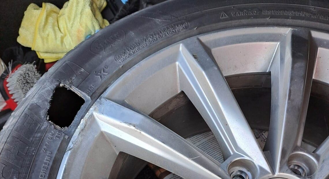 Τέτοιο θραύσμα κατάστρεψε το πίσω λάστιχο ενός αυτοκινήτου την περασμένη Κυριακή και κατά τον χρόνο αλλαγής του λάστιχου κάτω από επικίνδυνες συνθήκες, υπέστησαν σοβαρές ζημιές αλλά δύο αυτοκίνητα.
