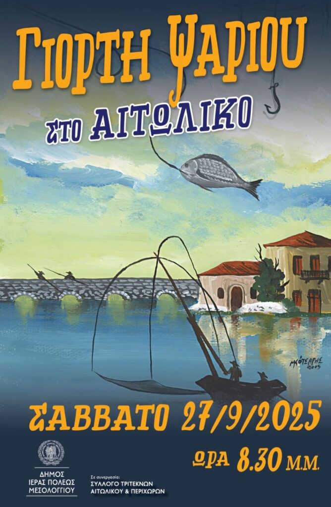 Ο Δήμος Ιερής Πόλης Μεσολογγίου και ο Σύλλογος Τριτέκνων Αιτωλικού και Περιχώρων προσκαλούν όλους τους φίλους της καλής παρέας και της τοπικής γαστρονομίας στην Γιορτή Ψαριού, μια μοναδική εκδήλωση που προάγει τον πολύτιμο θησαυρό της Λιμνοθάλασσας του Αιτωλικού, το Σάββατο 27 Σεπτεμβρίου 2025, στις 20:30, στις γραφικές γειτονιές του Αιτωλικού.