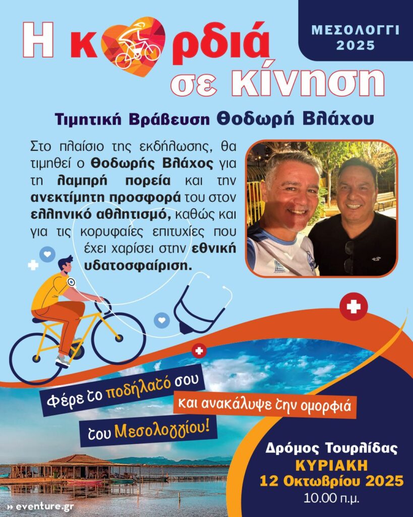 Στο πλαίσιο του 3ου Συνεδρίου Επεμβατικής Καρδιολογίας – Πύλη Καρδιάς (Ιερή Πόλη Μεσολογγίου, 10–11 Οκτωβρίου 2025, Αμφιθέατρο Περιφέρειας, εκδήλωση ανοικτή στο κοινό), διοργανώνεται η ποδηλατική δράση «Η Καρδιά σε Κίνηση», την Κυριακή 12 Οκτωβρίου 2025, στις 10:00 π.μ., στον Δρόμο Τουρλίδας.