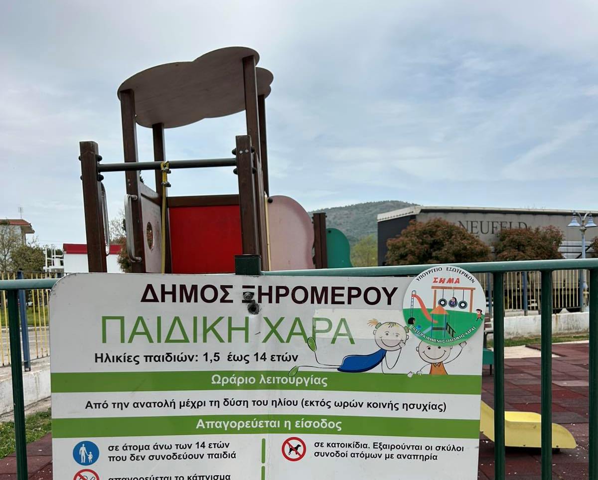 - Και για τις 18 παιδικές χαρές του Δήμου Ξηρομέρου, υπάρχει το σχετικό σήμα καταλληλότητας από το Υπουργείο Εσωτερικών, όπως φαίνεται στις επισυναπτόμενες φωτογραφίες, το οποίο ανανεώνεται σύμφωνα με τη νομοθεσία.