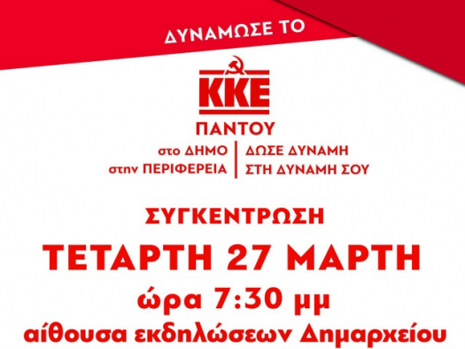 Η ΚΟΒ Θέρμου του ΚΚΕ διοργανώνει συγκέντρωση με σύνθημα «Δυνάμωσε το ΚΚΕ παντού! Στο δήμο, στην περιφέρεια, δώσε δύναμη, στη δύναμή σου!», την Τετάρτη 27 Μάρτη, στις 7:30 μμ, στην αίθουσα εκδηλώσεων του Δημαρχείου Θέρμου.