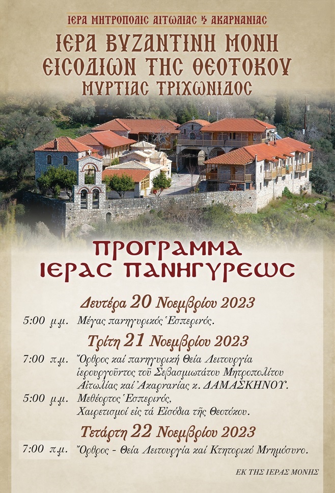Την Τρίτη 21 Νοεμβρίου 2023 πανηγυρίζει η Ιερά Βυζαντινή Μονή Μυρτιάς Τριχωνίδος, την μεγάλη θεομητορική εορτή των Εισοδίων της Υπεραγίας Θεοτόκου, που αποτελεί και την κύρια πανήγυρη της Μονής.