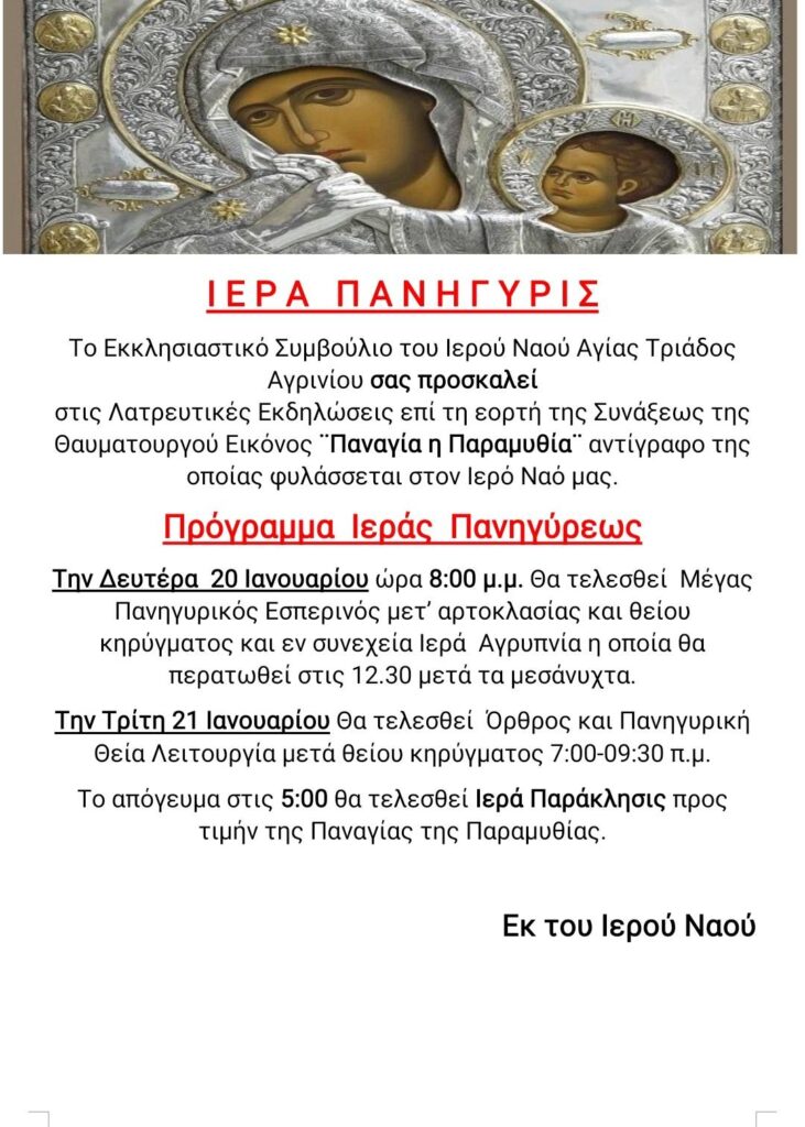 Ι.Ν Αγίας Τριάδας Αγρινίου: Λατρευτικές εκδηλώσεις για την εορτή της Παναγίας Παραμυθιάς