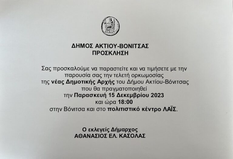 Την Παρασκευή 15 Δεκεμβρίου και ώρα 18.00 στο Πολιτιστικό Κέντρο ΛΑΙΣ της Βόνιτσας θα πραγματοποιηθεί η ορκωμοσία της νέας Δημοτικής Αρχής.