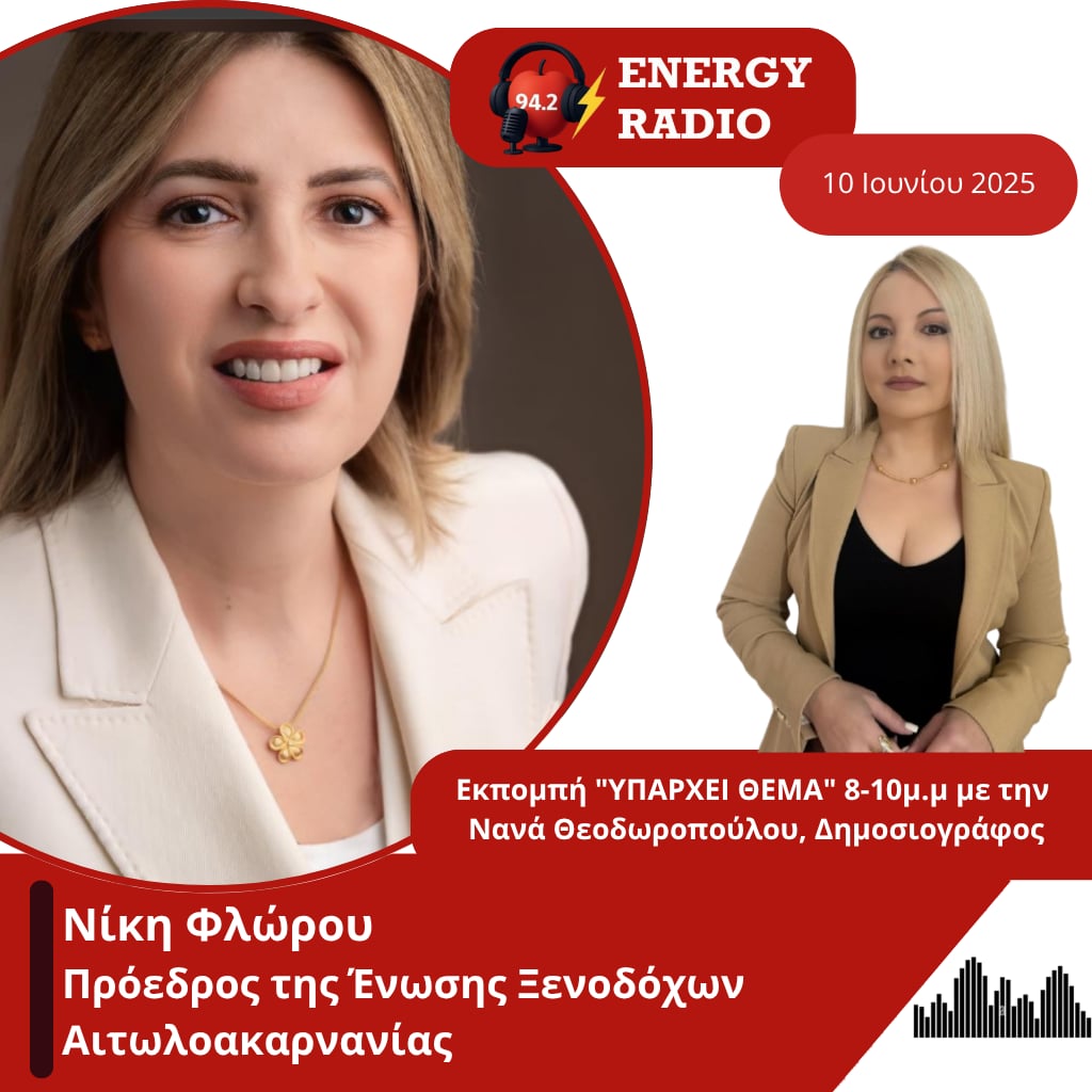 Η πρόεδρος της Ένωσης Ξενοδόχων Αιτωλοακαρνανίας Νίκη Φλώρου σε συνέντευξή της στην δημοσιογράφο Νανά Θεοδωροπούλου, στην εκπομπή «ΥΠΑΡΧΕΙ ΘΕΜΑ» στον Energy 94.2 αναφέρθηκε σε κρίσιμα θέματα που απασχολούν τον κλάδο των ξενοδόχων και του Τουρισμού. Αναφέρθηκε στην υψηλή φορολογία που λειτουργεί σαν βαρίδι για τα ξενοδοχεία και στο πως προχωρά η εφαρμογή της ψηφιακής κάρτας εργασίας.