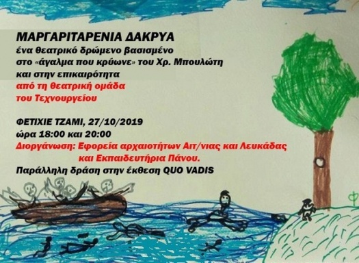H Εφορεία Αρχαιοτήτων Αιτ/νίας και Λευκάδος, τα Εκπαιδευτήρια Πάνου και το Τεχνουργείον Πολυχώρος Τέχνης παρουσιάζουν στο Φετιχιέ τζαμί Ναυπάκτου την θεατρική παράσταση «Μαργαριταρένια Δάκρυα».