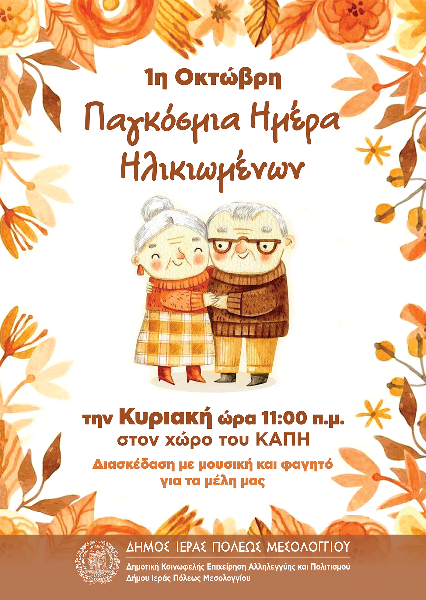 Μια γιορτή αφιερωμένη στην τρίτη ηλικία, στην προσφορά των αγαπημένων μας προσώπων, από το συγγενικό ή το φιλικό μας περιβάλλον, διοργανώνει η Δημοτική Κοινωφελής Επιχείρηση, Αλληλεγγύης και Πολιτισμού του Δήμου Ι.Π. Μεσολογγίου, την Κυριακή 1 Οκτωβρίου 2023, στις 11 π.μ στο χώρο του Κέντρου Ανοικτής Προστασίας Ηλικιωμένων ( Κ.Α.Π.Η. ).