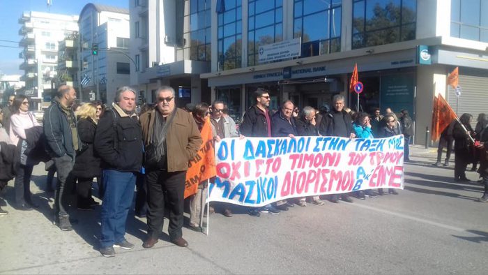 Με κεντρικό σύνθημα στο πανό των εκπαιδευτικών σωματείων «ΟΙ ΔΑΣΚΑΛΟΙ ΣΤΗΝ ΤΑΞΗ, ΟΧΙ ΣΤΟ ΤΙΜΟΝΙ ΤΟΥ ΤΡΟΜΟΥ – ΜΑΖΙΚΟΙ ΔΙΟΡΙΣΜΟΙ ΕΚΠΑΙΔΕΥΤΙΚΩΝ ΤΩΡΑ», διαδήλωσαν καθηγητές και δάσκαλοι μπροστά από την Περιφερειακή Διεύθυνση Δυτικής Ελλάδας στην Πάτρα, στις 17.01.2020. Προχωρήσαμε μάλιστα σε συμβολικό αποκλεισμό της οδού και ενός λεπτού σιγή στη μνήμη των εκλιπόντων αδικοχαμένων συναδέλφων.
