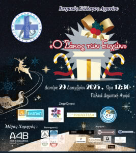 Παράλληλα, στο πλαίσιο των εορταστικών δράσεων, τη Δευτέρα 29 Δεκεμβρίου 2025 και ώρα 17:30, στην Παλαιά Δημοτική Αγορά Αγρινίου, θα πραγματοποιηθεί, για δεύτερη συνεχόμενη χρονιά, η χριστουγεννιάτικη δράση του Συλλόγου με τίτλο «Ο Σάκος των Ευχών».