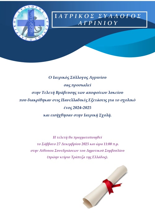 Στο πλαίσιο αυτό, διοργανώνει την Τελετή Βράβευσης των αποφοίτων Λυκείου που διακρίθηκαν στις Πανελλαδικές Εξετάσεις του σχολικού έτους 2024–2025 και πέτυχαν την εισαγωγή τους στην Ιατρική Σχολή.