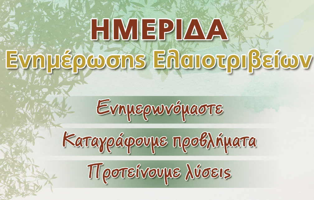 Ο Πανελλήνιος Σύνδεσμος Ελαιουργείων – ΠΑΣΕΛ, με την Αιγίδα του Υπουργείου Αγροτικής Ανάπτυξης, του ΕΛΓΟ ΔΗΜΗΤΡΑ, των κατά τόπους Επιμελητηρίων αλλά και των εθνικής εμβέλειας φορέων του ελαιοκομικού τομέα, όπως η Εθνική Διεπαγγελματική Οργάνωση Ελαιολάδου (ΕΔΟΕ) και η Επιστημονική Λέσχη Φίλων Ελαιολάδου & Ελιάς (ΦΙΛΑΙΟΣ), διοργανώνει 4 Ημερίδες Ενημέρωσης των Ελαιοτριβέων στις πρωτεύουσες βασικών ελαιοπαραγωγικών νομών (Λαμία, Αγρίνιο, Πολύγυρος, Τρίπολη) με στόχο την ενημέρωση όλων των ιδιοκτητών και στελεχών ελαιουργείων καθώς και των ελαιοπαραγωγών.