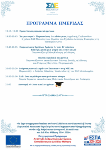 Πρόγραμμα της ημερίδας ευαισθητοποίησης –διάχυσης αποτελεσμάτων Erasmus+ και τελετής αποφοίτησης του ΣΔΕ Μεσολογγίου, η οποία θα πραγματοποιηθεί την Παρασκευή 30 Ιουνίου 2023 στις 7:30 μ.μ. στην αίθουσα εκδηλώσεων του σχολικού συγκροτήματος ΕΠΑ.Λ.-ΕΚ-ΔΙΕΚ-ΣΔΕ.