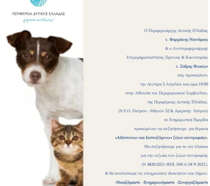 Ενημερωτική Ημερίδα για τα θέματα των «Αδέσποτων και Δεσποζόμενων Ζώων συντροφιάς» θα πραγματοποιηθεί τη Δευτέρα 3 Απριλίου 2023 και ώρα 19:00 στην αίθουσα του Περιφερειακού Συμβουλίου. Επίσης, θα συζητηθεί το νέο πλαίσιο για την ευζωία των ζώων συντροφιάς ενώ θα αναλυθούν οι υποχρεώσεις ιδιοκτητών και Δήμων.