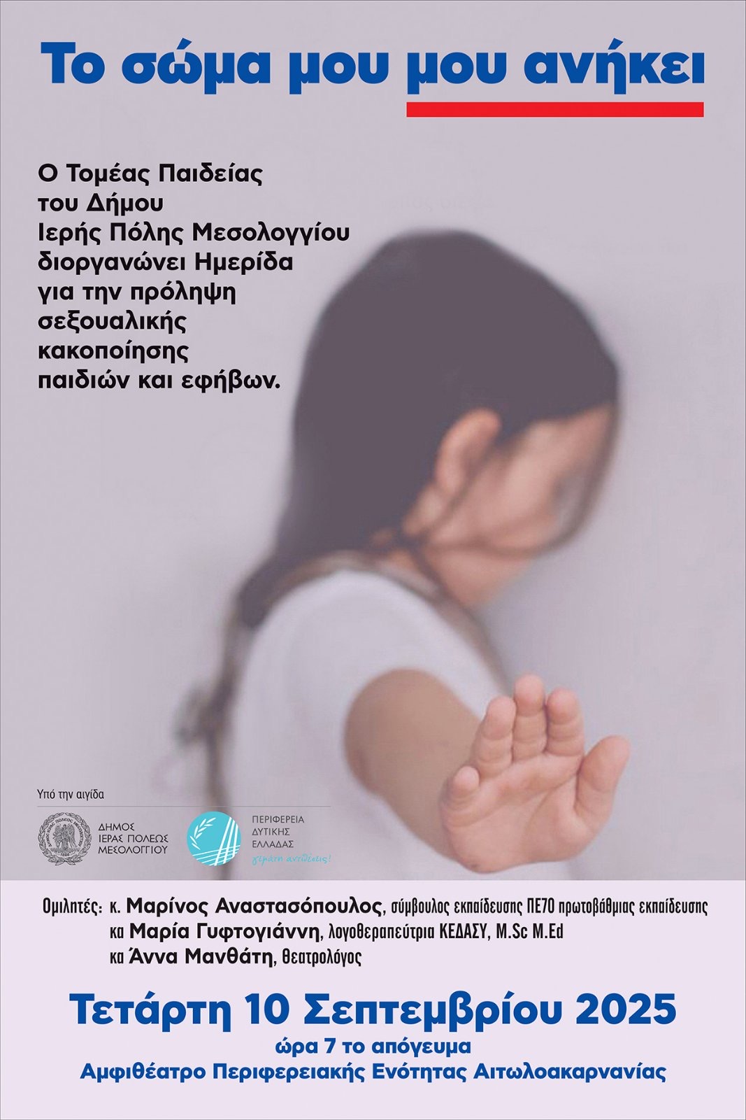 Ο Τομέας Παιδείας του Δήμου Ιερής Πόλης Μεσολογγίου διοργανώνει την ημερίδα «Το σώμα μου μου ανήκει», την Τετάρτη, 10 Σεπτεμβρίου 2025 στις 19:00, στο Αμφιθέατρο της Περιφερειακής Ενότητας Αιτωλοακαρνανίας (Κύπρου 30, Μεσολόγγι).