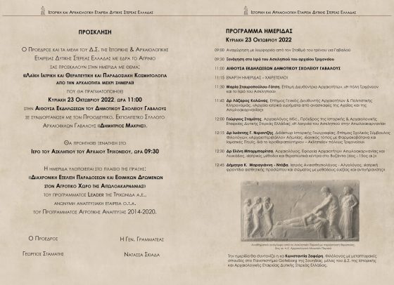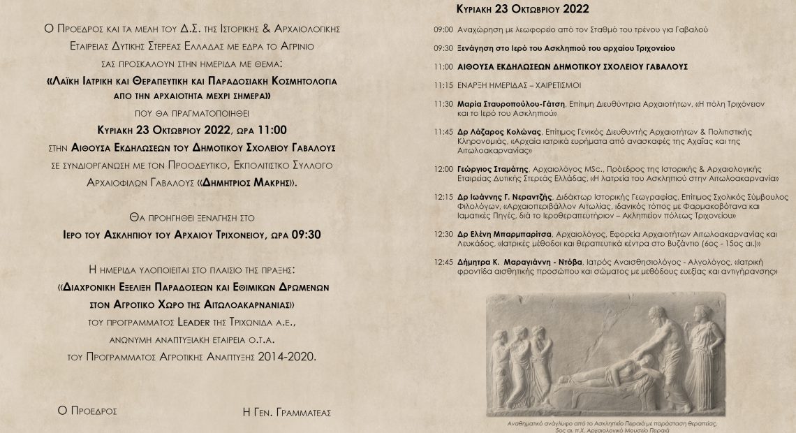 είμαστε στην ευχάριστη θέση να σας ανακοινώσουμε μετά την περσινή 1η επιτυχημένη ημερίδα της Εταιρείας μας στη Δογρή Τριχωνίδας, την πραγματοποίηση της 2ης κατά σειρά θεματικής ημερίδας που θα πραγματοποιηθεί στη Γαβαλού Μακρυνείας την Κυριακή 23 Οκτωβρίου 2022 και ώρα 11:00 με θέμα: “Λαϊκή Ιατρική και Θεραπευτική και Παραδοσιακή Κοσμητολογία από την αρχαιότητα μέχρι σήμερα“. Θα προηγηθεί ξενάγηση στο Ιερό του Ασκληπιού του αρχαίου Τριχονείου (Γαβαλού) ώρα 09:00. Επίσης, θα θέλαμε να σας ενημερώσουμε ότι η Εταιρεία μας έχει εξασφαλίσει τη δωρεάν μετακίνηση όσων επιθυμούν να παρακολουθήσουν την ξενάγηση και την ημερίδα με λεωφορείο που θα ξεκινήσει από τον σταθμό του τρένου στο Αγρίνιο, ώρα 09:00 (απαραίτητη είναι η κράτηση θέσεων στα παρακάτω τηλέφωνα: 6946093307: Γιώργος Σταμάτης, 6939466286:Σοφία Μιμιγιάννη). Θα είναι ιδιαίτερη η χαρά μας να μας τιμήσετε με την παρουσία σας, αλλά και να δημοσιεύσετε τις δράσεις της ημερίδας μας.