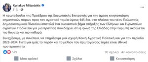 Ο Κυριάκος Μητσοτάκης προέβη σε ανάρτηση με την οποία αναφέρεται στην πρωτοβουλία της Προέδρου της Ευρωπαϊκής Επιτροπής για την άμεση κινητοποίηση σημαντικών πόρων προς τον αγροτικό τομέα, τονίζοντας τη σημασία της στήριξης των Ελλήνων αγροτών και τον ρόλο της Ελλάδας στις ευρωπαϊκές αποφάσεις.