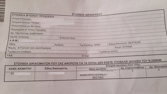 Η ειδοποίηση δεν είχε παραλήπτη κάποιον συγγενή αλλά τον ίδιο τον αποβιώσαντα.Μάλιστα μετά την αρχική έκπληξη όπως διαπίστωσαν το συγκεκριμένο ακίνητο έχει ήδη ΚΑΕΚ ,αφού είχε δηλωθεί από τον νόμιμο ιδιοκτήτη και έχει αναγνωρισθεί στις πρόσφατες αναρτήσεις του κτηματολογίου, όπως δήλωσε στο kainourgiopress ο άνθρωπος που παρέλαβε την ειδοποίηση(φωτο).
