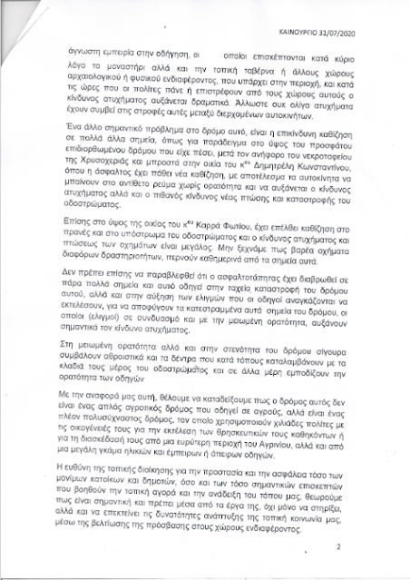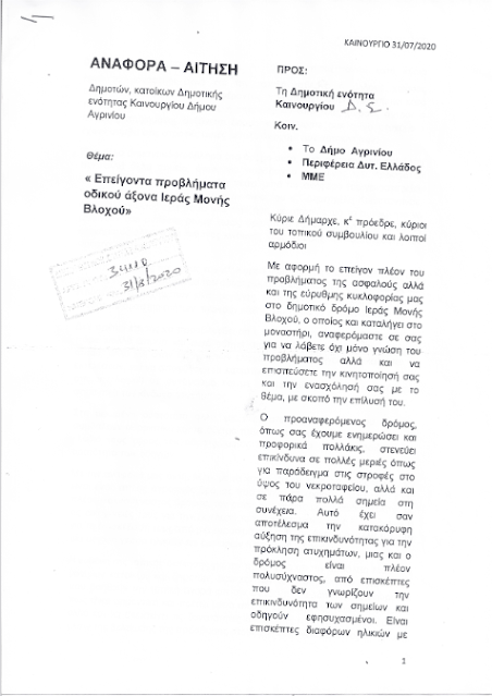 Με επιστολή τους κάτοικοι της οδού Ιεράς Μονής Βλοχού που βρίσκεται βόρεια του Καινουργίου και οδηγεί στην Ι. Μ Βλοχού διαμαρτύρονται για τα προβλήματα και την αδιαφορία που εισπράττουν από τους αρμοδιούς.
